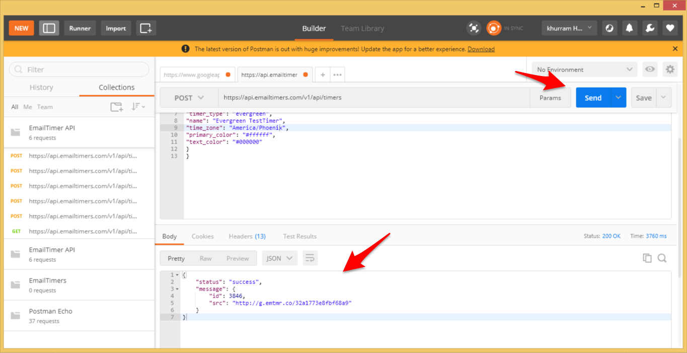 8. If the response shows a status of Success then your timer is created, you can go to your EmailTimers dashboard and edit newly created timer as per your requirements.